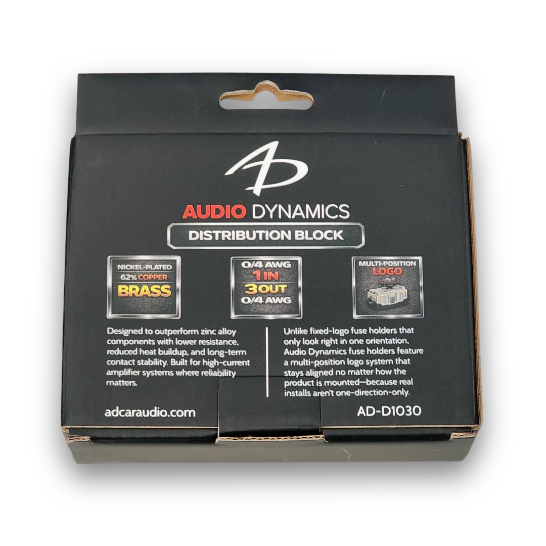 Unlike fixed-logo fuse holders and distribution blocks that only look right in one direction, Audio Dynamics fuse holders and distribution blocks feature a multi-position logo system that stays aligned no matter how the product is mounted-because real installs aren’t one-direction-only.