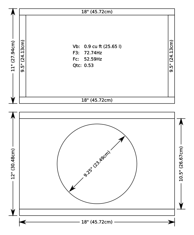 Nominal Diameter 10in Overall Diameter 10.28in / 261mm Mounting Hole Diameter 9.12in / 231mm Bolt Hole Circle Diameter Motor Outer Diameter Mounting Depth 5.00in / 127mm Required Pole Vent Clearance Driver Displacement 0.04 cu ft / 1.32l Minimum Sealed Volume 0.54 cu ft / 15.5l net Minimum Vented Volume 0.91 cu ft / 26l net* * Tune for desired response