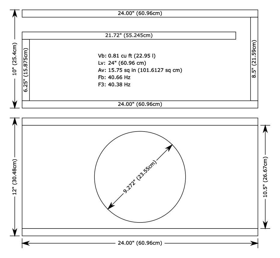Fs 49.730 Hz Qms 7.433 Vas 17.910 l Cms 0.122 mm/N Mms 83.300 g Rms 3.541 kg/s Dia 202.500 mm Sd 322.062 cm² Qes 0.756 Re 7.153 Ω Le 1.857 mH Z 8.584 Ω Bl 15.697 Tm Bl²/Re 34.447 N²/W Qts 0.686 no 0.281 % SPL 86.635 dB EBP 65.815 Nominal Diameter 10in Overall Diameter 10.20in / 259mm Mounting Hole Diameter 8.94in / 227mm Bolt Hole Circle Diameter Motor Outer Diameter Mounting Depth 5.04in / 128mm Required Pole Vent Clearance Driver Displacement 0.044 cu ft / 1.25 l Minimum Sealed Volume cu ft / l net Minimum Vented Volume cu ft / l net* Infinite Baffle Approved * Tune for desired response