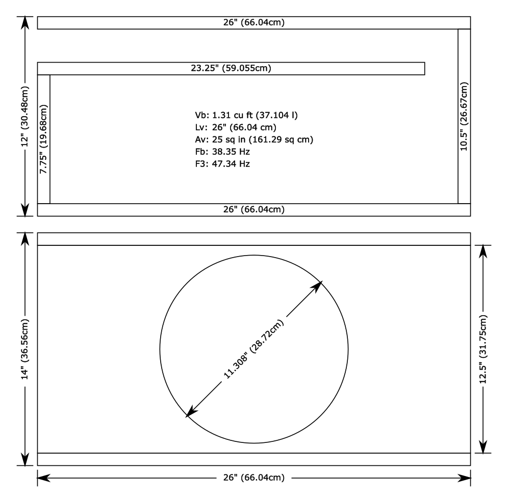 Fs 44.140 Hz Qms 6.295 Vas 39.860 l Cms 0.115 mm/N Mms 112.200 g Rms 4.997 kg/s Dia 251.000 mm Sd 494.809 cm² Qes 0.870 Re 7.175 Ω Le 1.774 mH Z 8.610 Ω Bl 16.021 Tm Bl²/Re 35.771 N²/W Qts 0.764 no 0.380 % SPL 87.944 dB EBP 50.741 Nominal Diameter 12in Overall Diameter 12.36in / 314mm Mounting Hole Diameter 11in / 279mm Bolt Hole Circle Diameter Motor Outer Diameter Mounting Depth 5.39in / 137mm Required Pole Vent Clearance Driver Displacement 0.06 cu ft / 1.78l Minimum Sealed Volume 1.25 cu ft / 35l net Minimum Vented Volume 2.00 cu ft / 56l net* Infinite Baffle Approved * Tune for desired response