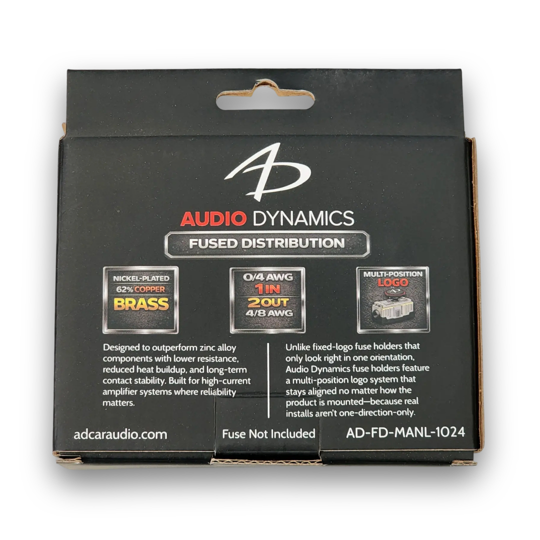 Unlike fixed-logo fuse holders and distribution blocks that only look right in one direction, Audio Dynamics fuse holders and distribution blocks feature a multi-position logo system that stays aligned no matter how the product is mounted-because real installs aren’t one-direction-only.
